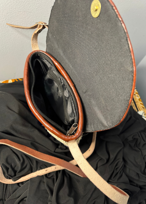 The hand-stitched leather flap is detailed with traditional bead patterns, forming a radiant design that draws the eye and honors heritage. A soft inner lining keeps your items safe while the adjustable leather strap ensures a comfortable crossbody fit.